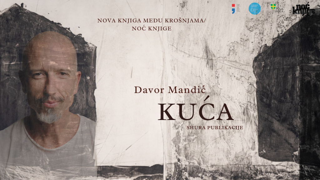 Povodom proslave Noći knjige, u četvrtak, 23. travnja u 19:00 sati održat će se predstavljanje zbirke pjesama “Kuća” (Shura publikacije) novinara i pisca Davora Mandića. Prva je to njegova konceptualna zbirka pjesama, okupljena oko motiva kuće, a potaknuta serijom grafika njegove životne i umjetničke partnerice Nadije Mustapić, s kojom zajedno istražuje kuću, od njene idejne i konkretne pojavnosti do koncepta doma koji zajedno pokušavaju izgraditi.