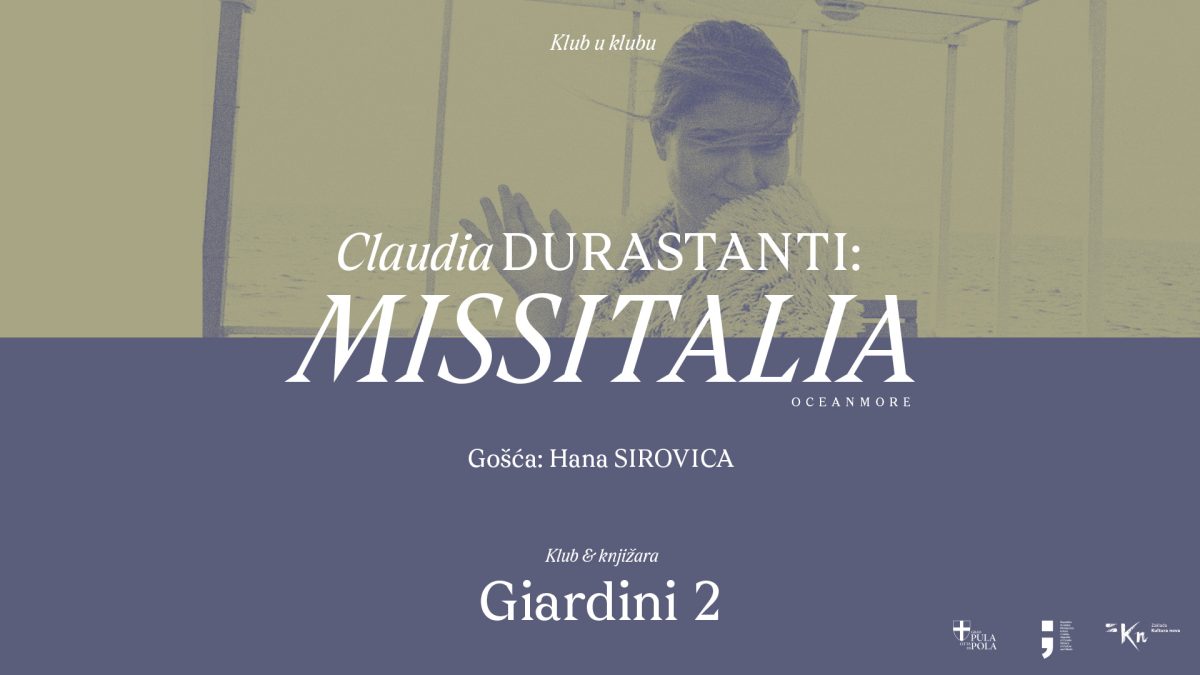 U utorak 16. rujna u 19:00 sati u Klubu-knjižari Giardini 2 održat će se prvo jesensko izdanje Kluba u klubu – čitateljskog kružoka Giardini 2 uz gostovanje Hane Sirovica, komparatistice književnosti, feministice, kritičarke i urednice. . Rasprava će se voditi o tek objavljenoj knjizi, romanu „Missitalia“ (OceanMore) Claudie Durastanti, jedne od najznačajnijih suvremenih talijanskih spisateljica. […]